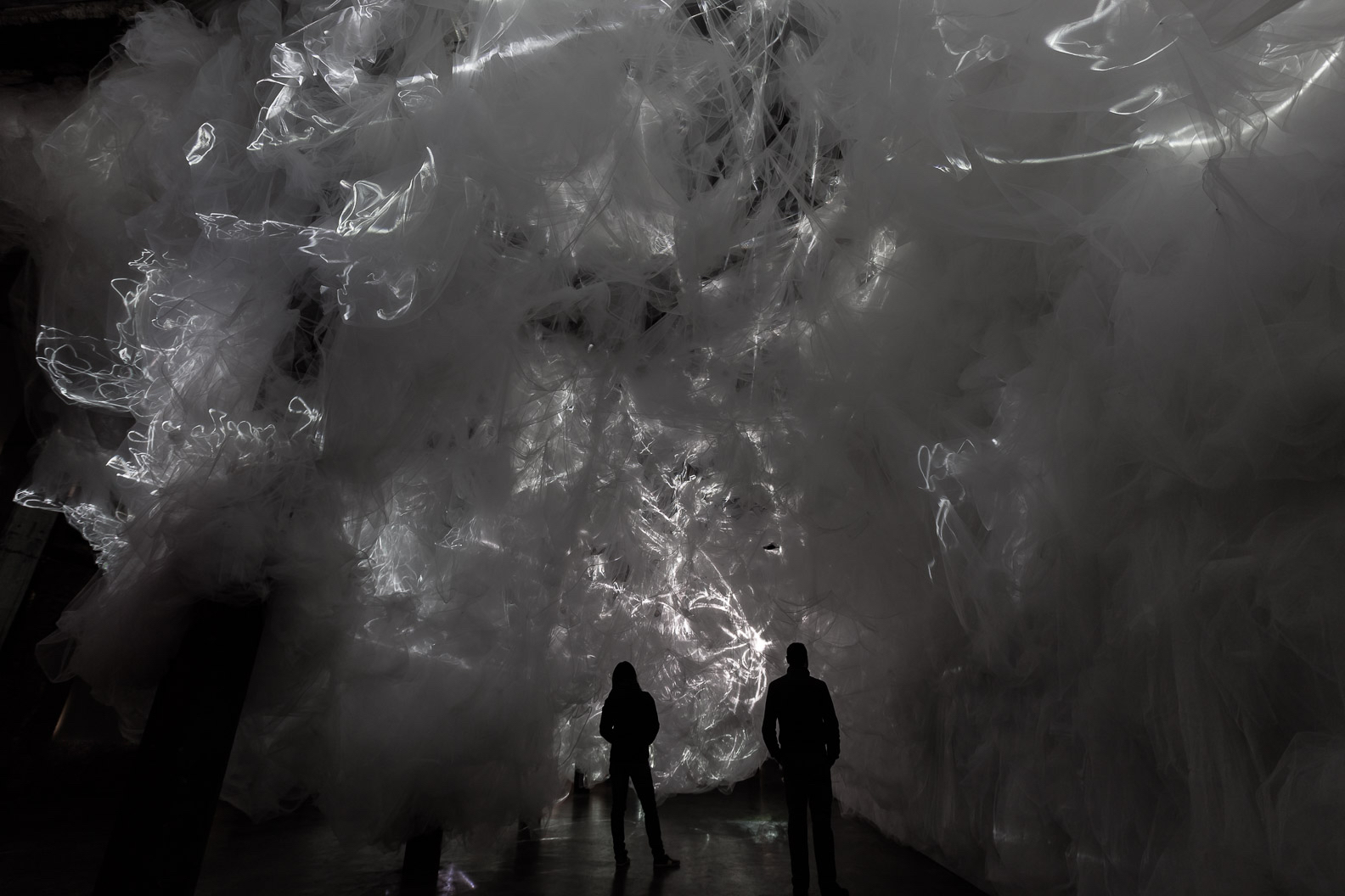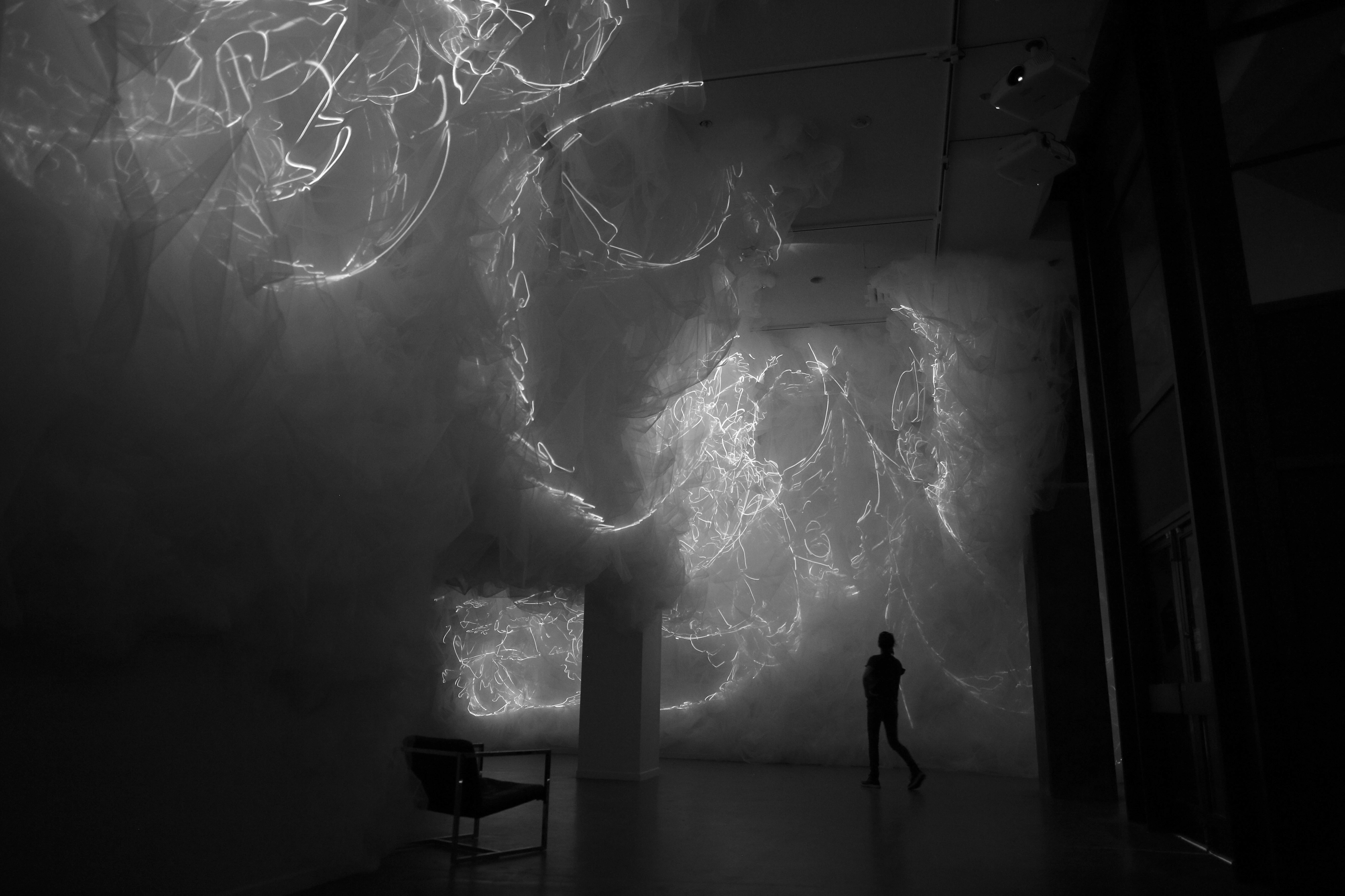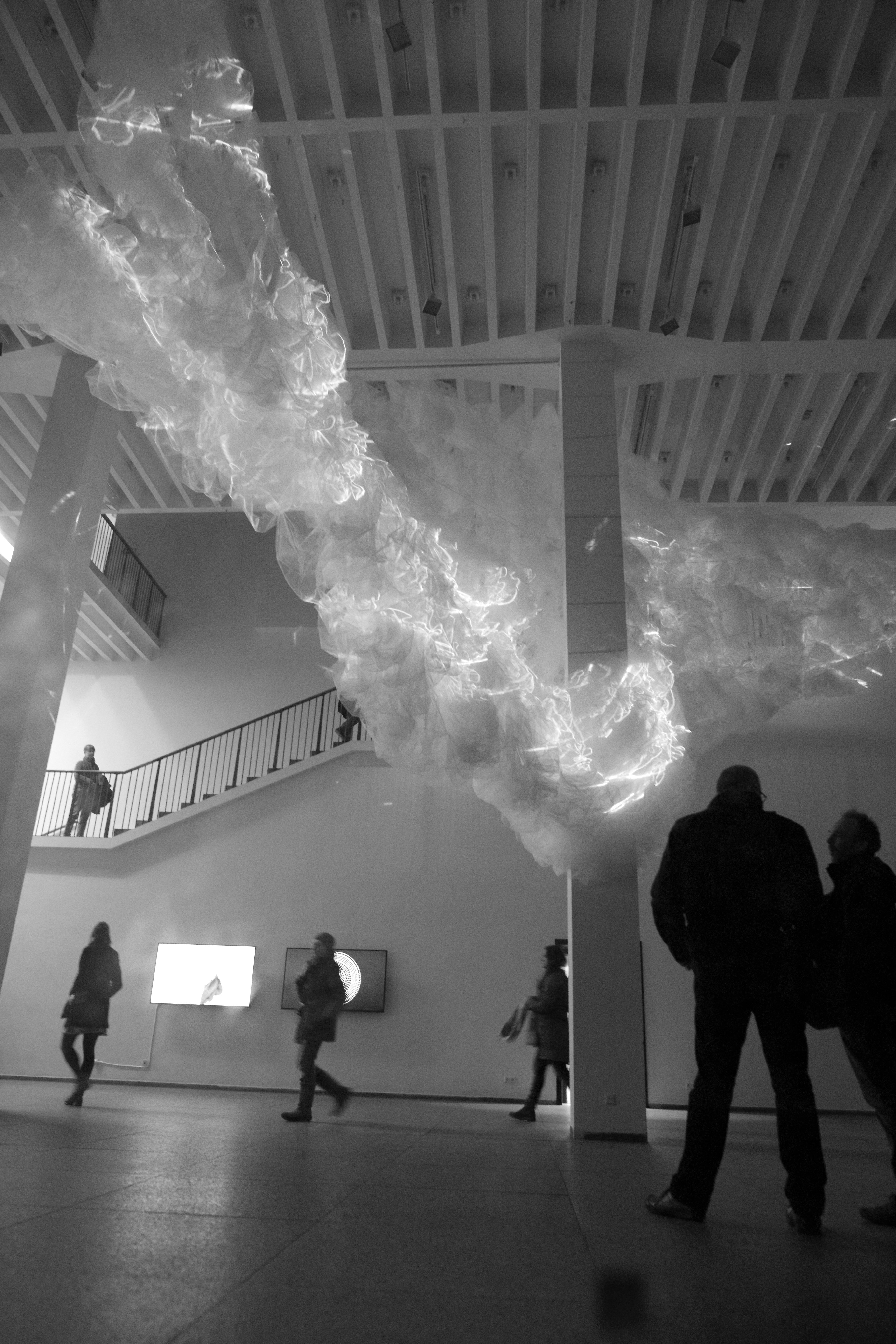 BREATH OF THE SEA opened August 29th in Halifax, Nova Scotia at Dalhousie Art Gallery in the show "Atmospheric Events: James Geurts, Christine Sciulli, Andreas Schmid", part of RESPONSIVE: International Light Art Project Halifax. Breath of the Sea is a 10 channel video, site specific, architectural intervention commissioned by Dalhousie Art Gallery and co-produced with the Anna Leonowens Gallery, NSCAD University, with generous support of the Canada Council for the Arts. The fabric and video work swarms through low ceiling spaces into the 63'x 22' x18' high brutalist gallery, and is also viewed from the mezzanine above via four large irregular hexagonal portals.